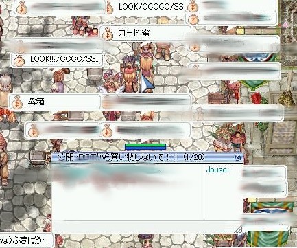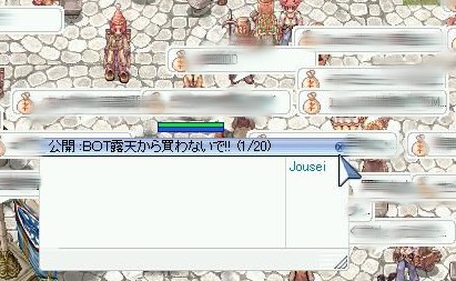 ( From ) : あのすみません ( From ) : BOT殲滅っていうのはイイと思うのですが ( From ) : このあたりBOT商店っていうのは ( From ) : 普通の人もいるのでやめてほしいんですけど ( To ) : じゃあどうしたら? ( From ) : やめてほしいですね・・・ ( To ) : じゃあぼくが出してないとこで看板出してもらえませんか? ( To ) : この辺りは見てのとおり ( To ) : BOTの多い所です ( From ) : この辺よく売れるのですよ ( To ) : 僕は此処から動けませんので ( To ) : 何を言われても ( To ) : BOT不買活動はやめません ( To ) : すみませんが;移動して売って下さい;; ( From ) : かなりむちゃくちゃ言ってる自覚ありますかw ( To ) : でもこうしないとBOTのものが売れていくんです ( From ) : まぁ心意気は言いと思いますけど、普通の人に迷惑かからない方法探すべきでは ( From ) : ととりあえず言っておきます ( To ) : ほかにありますか?? ( From ) : なにがですか ( To ) : この鯖でBOTからかわせない方法が ( From ) : 難しいのでは・・・ ( From ) : BOTいなくなくするしか ( To ) : だから今はこの方法しか僕にはありません ( To ) : WPでBOT飛ばして通報している間に ( From ) : いやその方法とっても買う人買うから正直迷惑かけてるだけにしか見えません ・・・ 正直僕が出していたのは 「BOT商人から買わないで下さい!!」 「BOT露店から買い物しないで下さい」 「RMTに手を貸さないためにBOT露店から買い物しないで」 「RMTに手を出さないで」 「BOTを無くす為にBOTろてんから買わないで」 「お願い!BOT商人から買わないで」 (僕のチャットにかぶるように露店を立てたBOTに対し) 「↓のエル売りはBOTです買わないで下さい」 「この辺りはBOTが多くなってます!名前に気をつけてください!」 「この辺りはBOT商人が多くなっていますBOTから買わないで下さい」 「RMTで15億のお金が海外に不正に流れています」 「RMTに手を貸さないで下さい」 「買う前に名前の確認を」 としか言ってません 決して「この辺りは皆BOT商店」と勘違いされないように文章を入れました 僕は迷惑かけるつもりでチャット出してたわけじゃありません、 それに、「BOT商店から買わないで」という言葉は欠かさず出しています ・・・・それが迷惑なんでしょうか・・・ それとも売れない腹癒せだったんでしょうか・・・ PR